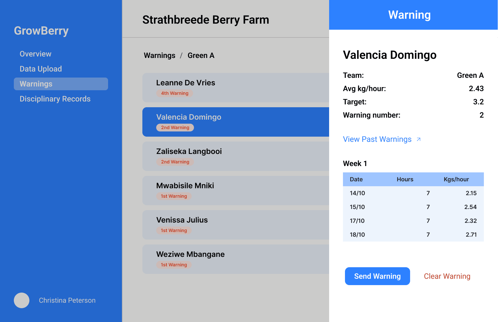 Here HR could click through to see daily performance and assess against mitigating factors, before deciding to send the warning via WhatsApp.